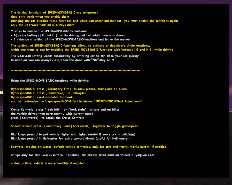 Tuning everywhere, attach neon tubes, attach neon effect lights, HyperSpeedNOS, Seaways, Driftsmoke Save 10 cars, Open Door Show, Animations, take wheel from trunk and install it, throw grenades, attach Missile Gun on car, Minigun, Police Light, Spotlight, Searchlight New effect.fxp, to display turnlights Engine ON/OFF, switch car lights, Passenger Driveby, unflip, undestructible, get Helmet and much more